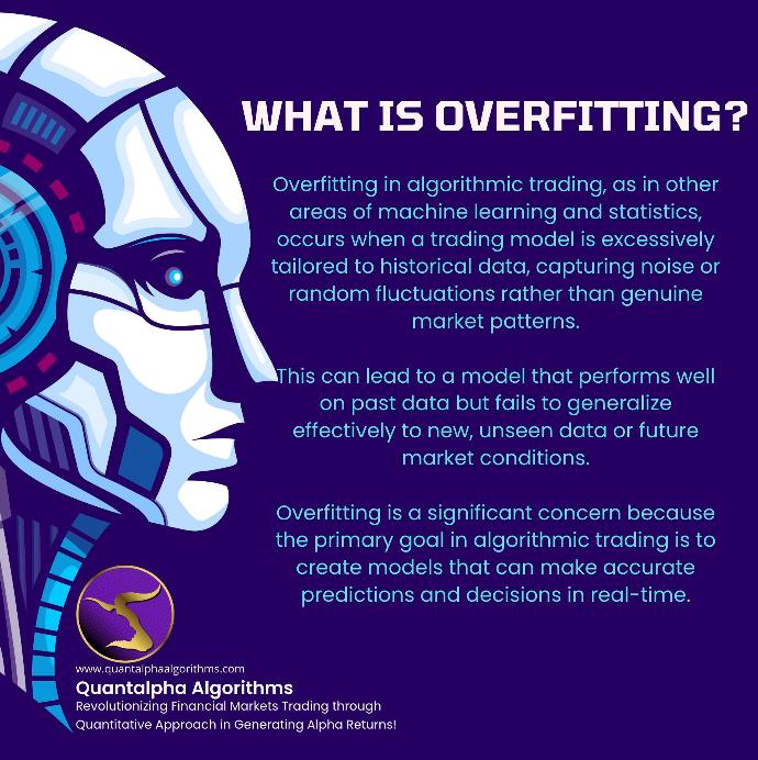 Overfitting in algorithmic trading, as in other areas of machine learning and statistics, occurs when a trading model is excessively tailored to historical data, capturing noise or random fluctuations rather than genuine market patterns.